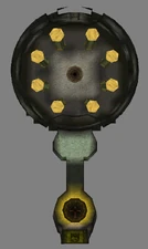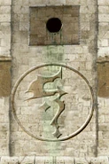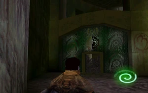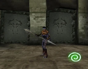 - Raziel's clan territory Warp gate uses the symbol of Raziel and the Razelim as its identification pattern and is the first to use a formal symbol associated with Kain's empire to do so, perhaps suggesting that the network was created after the rise of the clans and Kain's empire itself.[Soul Reaver][Soul Reaver/3] In earlier developmental versions the warp rooms are much more themed with the area they were placed in rather than the uniform design seen in the retail version and as such and the Razielim warp gate appropriately uses the white-grey brick and arches associated with the rest of the territory along with a Razielim symbol drawn onto the wall.[7][8][9]