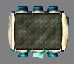 The drawbridge tower housed a number of additional secrets which could only be accessed after Raziel had gained the constrict ability. By using constrict to turn the dial in the drawbridge tower Raziel could make the switch lower the other drawbridges. The northwestern drawbridge led down a narrow corridor to the a large circular room with a domed room supported by several square pillars containing a health power up at the far end. The northeastern drawbridge led downstairs through a twisting corridor to an open rectangular with high ledges on opposite sides with a raised plinth in the middle of the central pit. Several Blocks were positioned around the room and completion of the block puzzle - by creating a platform high enough for Raziel to reach the far ledge - allowed Raziel to gain an Eldritch energy power-ups. The final drawbridge to the south west led up to a high ledge overlooking the previous bonfire courtyard. From her it was possible to see and jump to a high alcove and collect an Eldritch energy recharge.[Soul Reaver][Soul Reaver/13]
