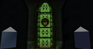 - The throne room itself has completely different stained glass murals with a pattern and face design. The chamber has two entrances in the corners of the room separated by a stained glass window – in retail there is only one which comes right through the middle of the stained glass while the original entrances are blocked off. Statues are positioned in T-poses.