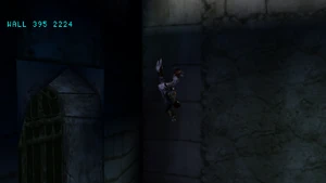when he jumps into a scale-able wall surface, he grabs on with his claws - the player can traverse a scaleable wall section using the D-pad (climbing up, downward, or left/right along the wall). When Raziel reaches a ledge at the top of a scaleable wall, he automatically climbs up; to drop off the wall, the player just has to press the jump (X) button.