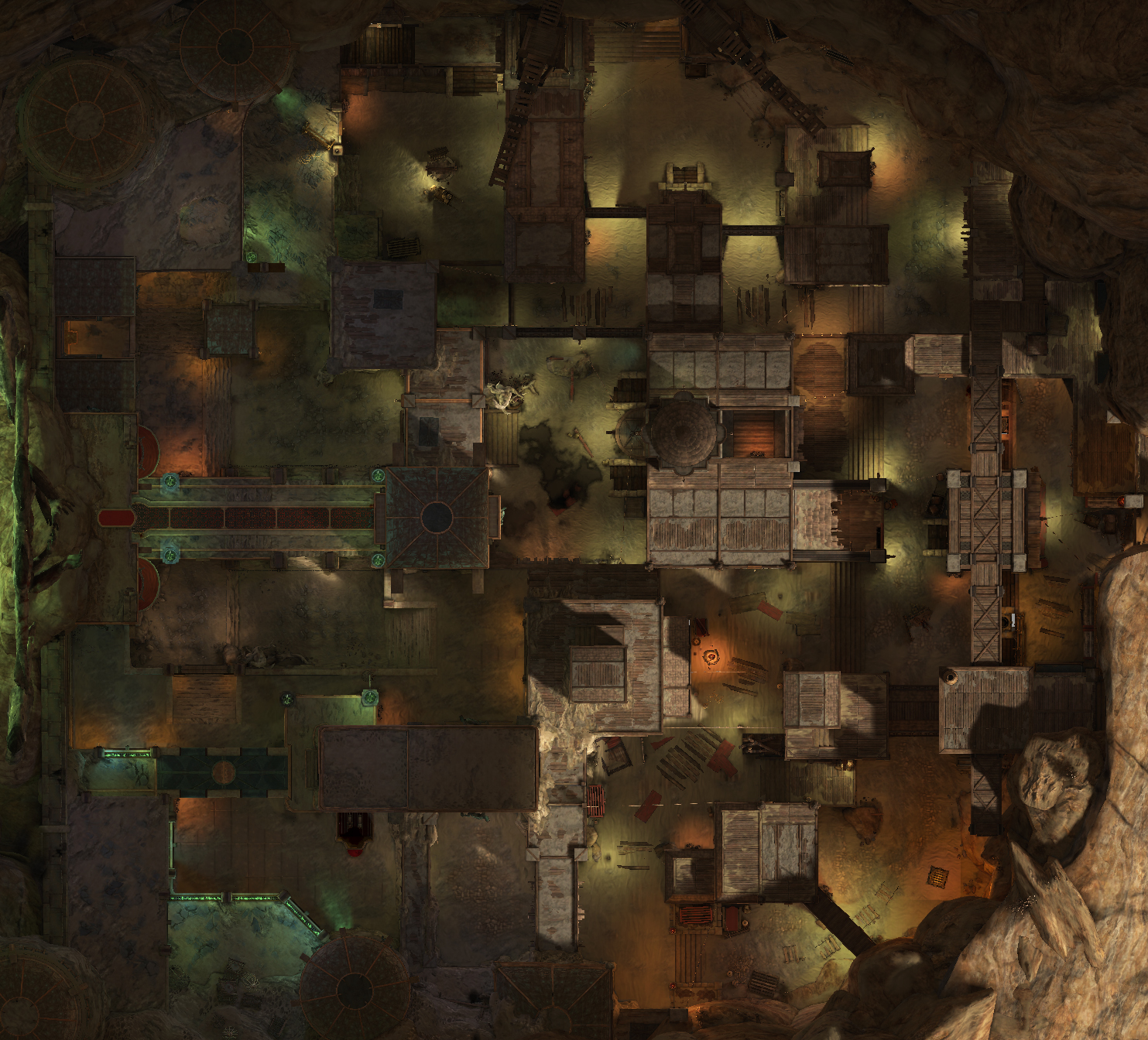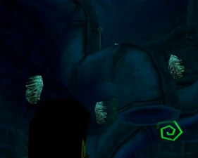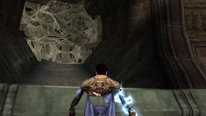 Throughout the Cathedral large pipe-like openings can be seen on the walls which are covered by webs that move with air current. This gives the impression of external openings that had been blocked by the zephonim.
