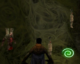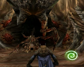 When Raziel returned, centuries after his execution, he sought out Zephon after gaining the Soul Reaver as a weapon. He had to manipulate the airflow of the Cathedral to reach the upper spires where Zephon dwelt. When Raziel finally reached Zephon, he discovered that Zephon, like much of his clan had (d)evolved in insectoid fashion, with Zephon claiming that he had become infused with the building, effectively making him immobile, though it is likely he fed on the cocooned humans imprisoned elsewhere in the Cathedral.