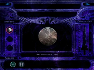 The Silver Half of the crest is gained in a room beneath Vorador's Mansion titled as the "Pillar Room" in the Prima Guide. The room notably features a puzzle inspired by elemental associations of the Soul Reaver and the Pillars of Nosgoth - with Raziel rotating pillars marked with the elemental symbols to match a solution mural in the background. The mural itself matches the elemental relationships first seen in the diagrams in the Subterranean Pillars chamber within the Subterranean Ruins in Soul Reaver 2 - albeit without directly mentioning the link to the Pillars of Nosgoth. Ultimately these relationships would be explored and explained throughout Legacy of Kain: Defiance as Raziel gained and used the Wraith Blade enhancements. The original diagram with the pillars symbols would also reappear later in Defiance as it was seen in the Garden Crypt at the end of the Find Vorador chapter.[Defiance][Defiance/8][Defiance strategy guide][Soul Reaver 2][Soul Reaver 2/3]