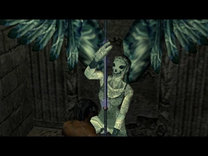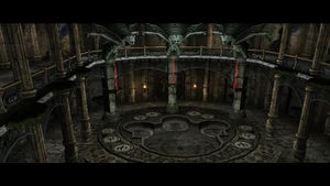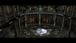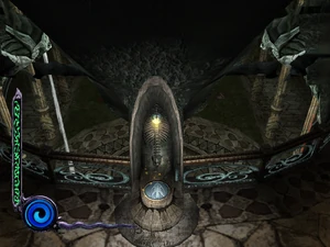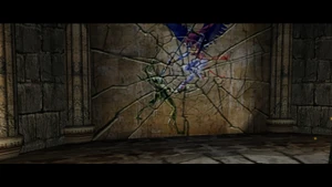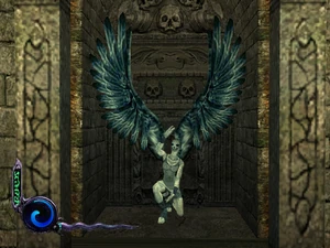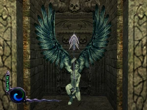Shortly after, Raziel could explore the flooded crypt beneath the mansion where he discovered a locked door marked with a skull-faced champion bearing a spear and sealed by an unusually-shaped lock. Exploring the nearby cistern, Raziel could recover the Gold and Silver halves of Vorador's Crest and return them to the flooded crypt - opening the way to the crypt chapel, where a statue of the champion was positioned. Using the Reaver spell of the Fire Reaver to light the Fire sconces within caused the Soul Stealer spear to appear in the hands of the statue, and once he had defeated the Guardian constructs that appeared he was free to take the spear.[Defiance][Defiance/8][Defiance strategy guide]