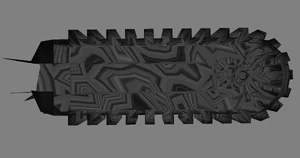 The forge itself appeared to be an untextured copy on the Sunlight Forge, with the same basic appearance and apparatus -potentially being used as a placeholder until the final design was completed or implemented. In a similar manner to the other forges the layout consisted of a long rectangular chamber with a curved end, adorned throughout with pillars on both sides - although this was barely noticeable with the textures and colorscheme. A wide shallow channel - also only barely distinguishable - could be seen running along the middle of the chamber towards the back of the room. At the curved end of the room, the channel ended in front of a large circular pedestal with a smaller raised font at its center. Directly above the pedestal was a circular construction held aloft by three legs emanating from the side and back walls around the pedestal. The ceiling of the area was domed and featured an open hole. Below the circular construction an tapering shape was positioned - apparently representing the similar sunbeam of the Sunlight forge.[2][3][4][1]