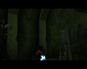 Returning to the open pipe chamber at the bottom of the Silenced Cathedral - usually by travelling from the lower cathedral warp gate - Raziel could jump down the middle pit to the fans at the bottom. From here he could reach a passage in the west which led down into a rocky series of caverns. Following through the caverns and defeating or avoiding the Zephonim vampires within led to a small clearing with a scalable wall and a high window. Smashing the window with Telekinetic force projectiles and climbing the wall would lead Raziel through to the Sound Glyph Altar area.[Soul Reaver][Soul Reaver/Sound][Soul Reaver strategy guide (Prima)]