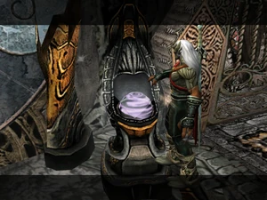 Looking for a replacement from another forge, Kain found his way to the usual portal rooms in the forge, but these were blocked by a sealed door which he opened by recovering the Earth Globe. Beyond he found portals to the Dark Forge and progressed through the forge to the portal rooms there where he found a warp to the Water forge which had collapsed into ruin - its surrounding devices were still present however, including an exposed Sphere of Energy which Kain could recover.[Defiance][Defiance/9][Defiance strategy guide]