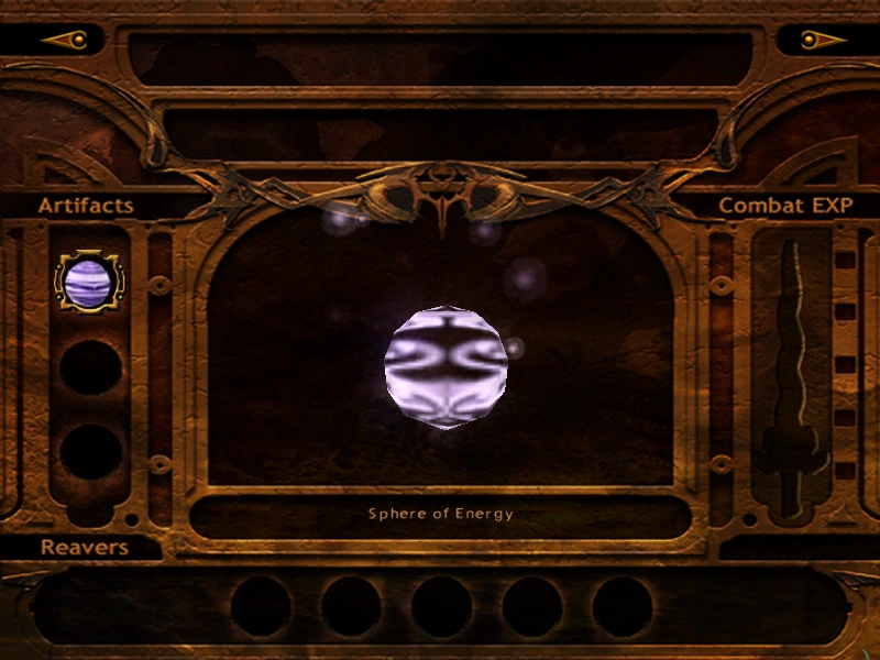 The Sphere of Energy is explicitly named as such in the inventory and its name is reiterated in the official guide - although in dialogue Kain simply refers to it as an "orb".[Defiance][Defiance/9][Defiance strategy guide] The artifact is labelled in game files as "cit_artifact_three" and its final holder is listed as "cit_lock_three". Other working spheres share a virtually identical texture set - these are labelled as "portal_pylon" and "portal_pylon_inert".[Defiance][Defiance/7][Defiance/9]