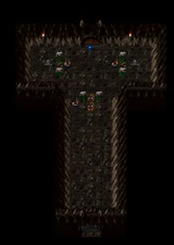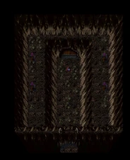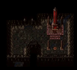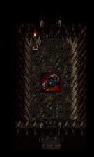 The last chamber was a wide passage that began heading north, turned sharply and headed east before turning again and heading south in a long 'n' shape. A short distance into the initial northern stretch the path bottle-necked between two rocks to where a purple magic sphere was positioned and immediately widened to an area in the corner where two dandy throwers and two scimitar swordsmen protected a blood vial. As Kain headed down the southern stretch the path would narrow and bottleneck between two rocks again, presenting a purple magic sphere and immediately widening to where two scimitar swordsmen awaited. At the bottom of the southern path was positioned a teleporter pad which returned Kain to the initial chamber of the dungeon.[Blood Omen][Blood Omen/5][Blood Omen strategy guide]