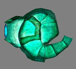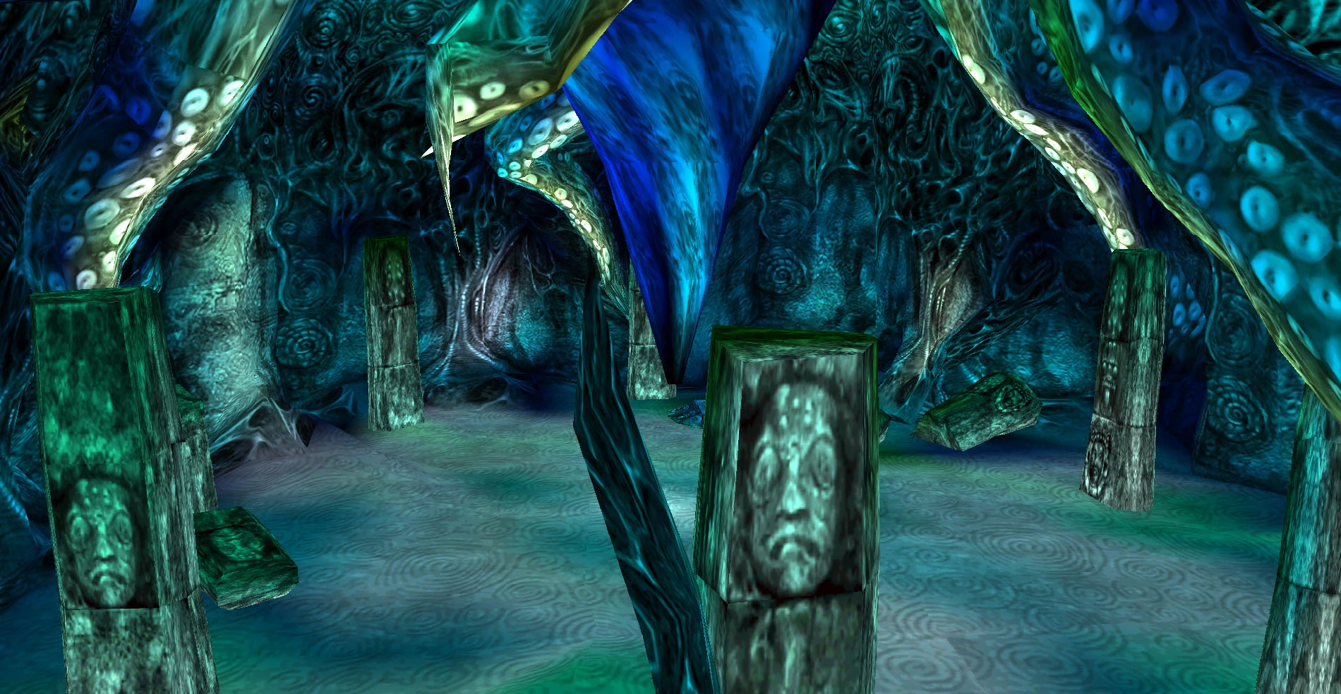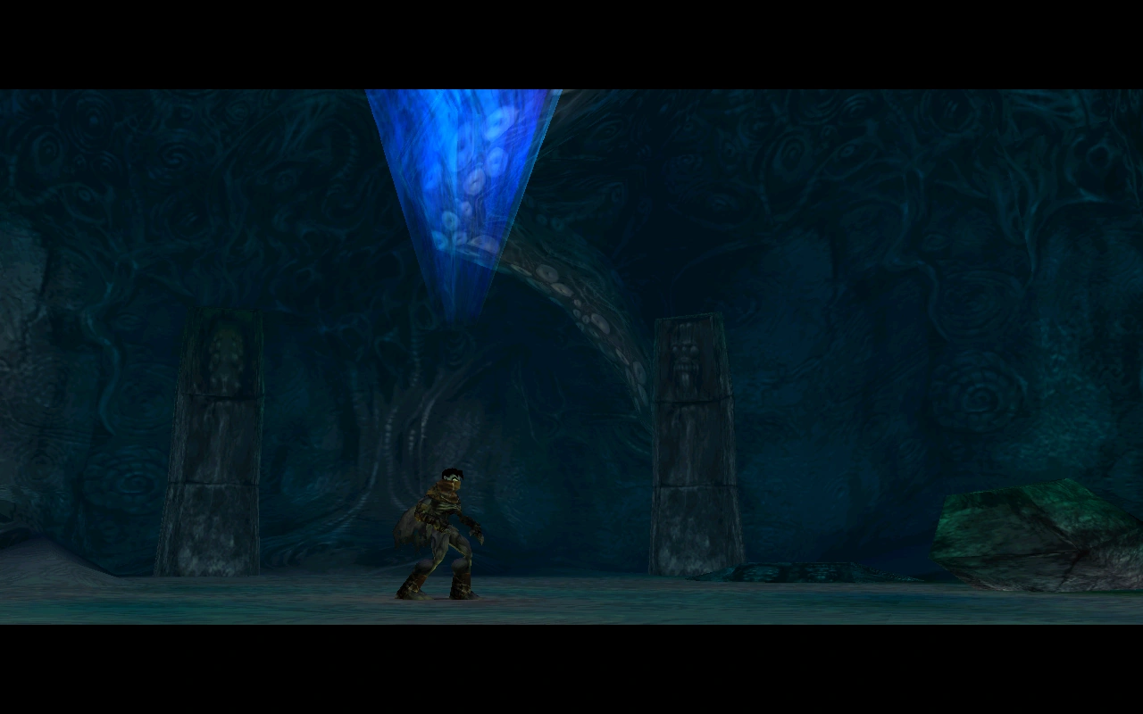 In the retail version of Soul Reaver there were some differences between the GlyphX FMV and gameplay versions of the Elder God's chamber. In the FMV the area was largely seen as a darkened room covered with the eyes and tentacles of the Elder God, a few feint spiral shapes, and with only a few broken featureless pillars dotted around. The gameplay version of the area was brighter and more detailed although less sharp in its graphical style. Here the eyes and tentacles of the Elder God were supplemented by a number spiral and shell formations in the walls of the cavern and feint spirals could also be seen in the sand on the floor of the area. A number of pillars were placed around the area giving the impression of a set of ruins - with each decorated with a number of inhuman faces. The raised Elder God's platform stood at one end of the chamber. Perhaps the most notable feature however was the blue whirling conical impression of the bottom of the Abyss which emanated from the center of the ceiling.[Soul Reaver][Soul Reaver/1][Soul Reaver/2]