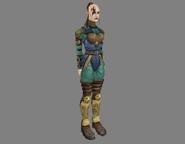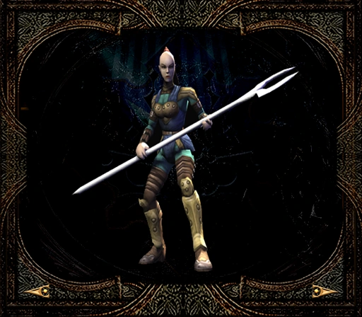 Vampire Hunter Mercenaries were female troops of Moebius's Vampire hunter faction, encountered by Raziel in the Blood Omen era at the start of Defiance. The Mercenaries wielded a two-handed two-pronged polearm or long bladed staff and wore clothing that consisted of various mismatched materials including a short blue dress-like layer worn over longer-sleeved green undergarments and topped with leathery brown padding at the shoulders, breasts, forearms, waist and thighs - and with lighter brown greaves and boots on the lower legs. Most of the mercenaries hair was shaved, leaving only a short bun atop the head with a few longer hairs behind. Mercenaries also notably bore a tattoo across one eye.[Defiance][Defiance/4][Defiance/6][Defiance/12][Defiance strategy guide]